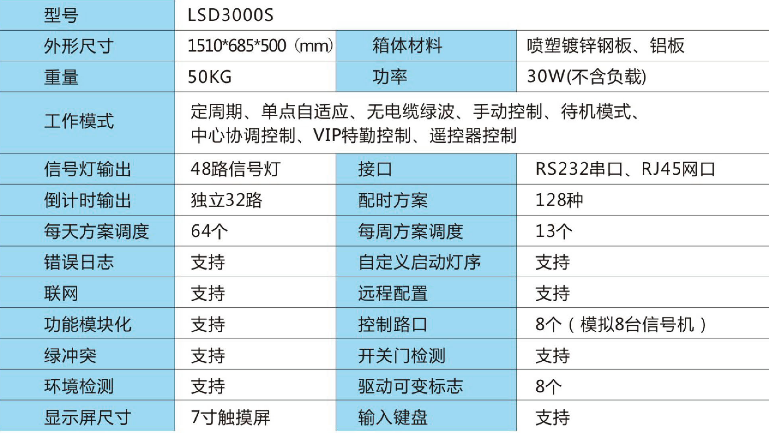 LSD3000S型交通信號控制機采用,穩(wěn)定、可靠的模塊化多處理器、多總線系統(tǒng)結(jié)構(gòu)。采用高速ARM控制器及大規(guī)模集成電路,實時運算道路交通信息,如道路交通狀態(tài)、道路車流量。全部信號機可以組成城城網(wǎng),完成于指揮中心信息交換。根據(jù)城市交通模型進行云計算,計算數(shù)據(jù)。帶有一塊7寸液晶觸摸顯示屏,和一個數(shù)字鍵盤。
